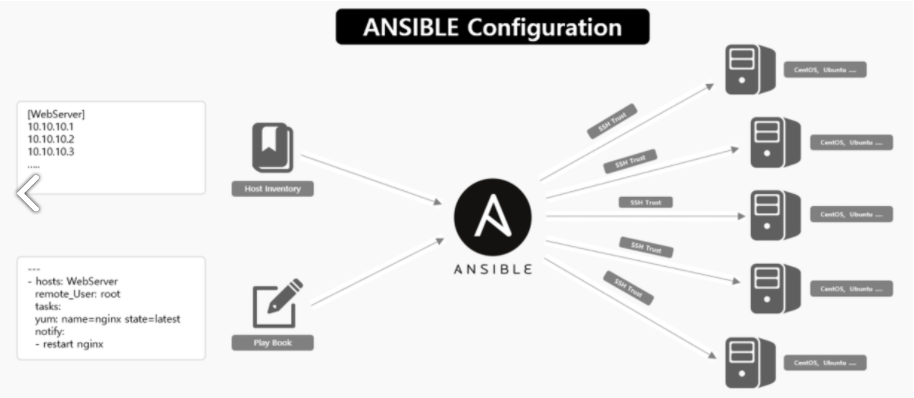 중앙에 Controller 에서 원격 서버 목록을 인벤토리 파일에 저장하고 있고, ansible 사용자가 작성한 플레이북을 바탕으로 원격 서버에 여러가지 작업을 수행합니다.